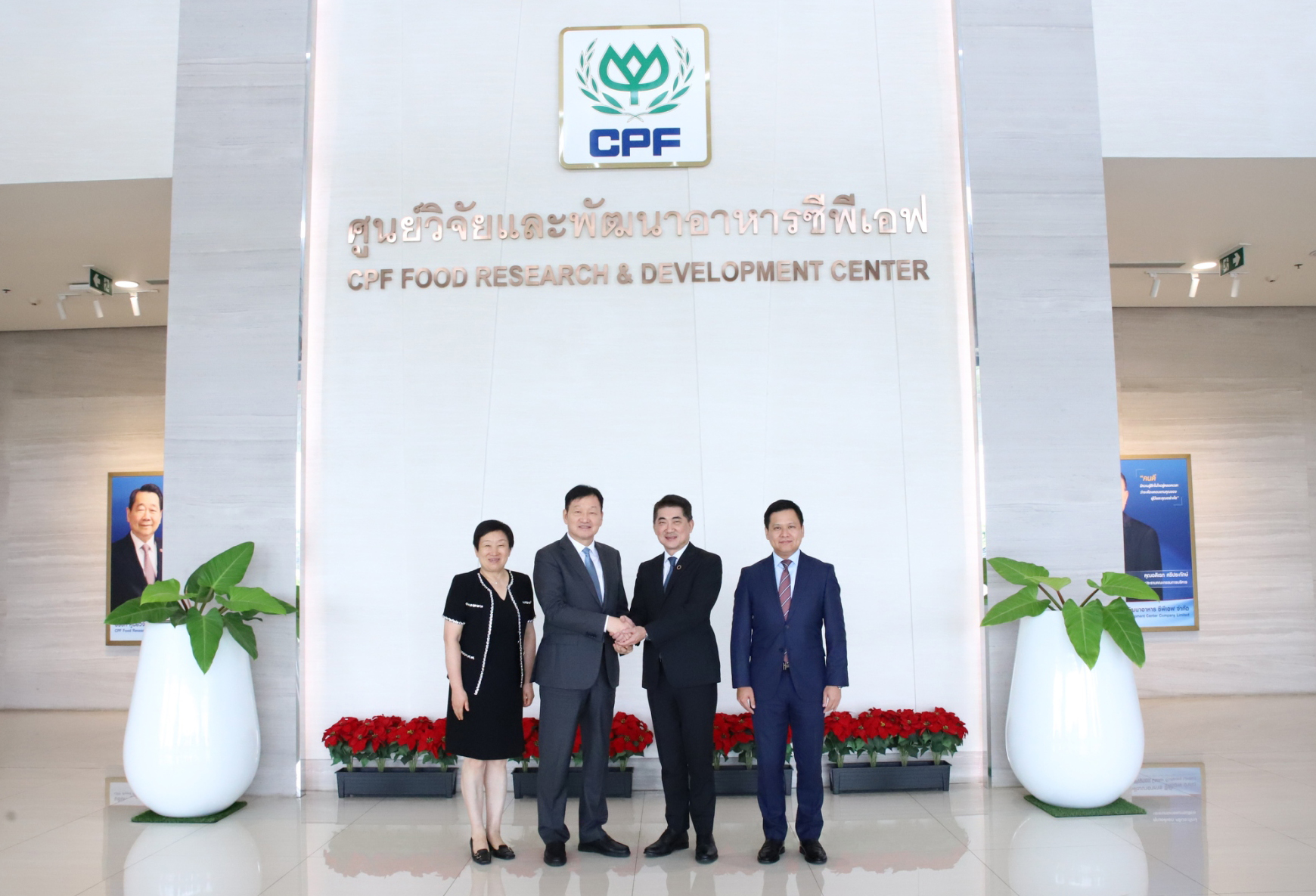 ▲在正大集團CPF食品研發中心,Mr.Prasit Boondoungprasert(右二)、黃偉偉集團資深副總裁(右一)熱情接待秦英林董事長(左二)、錢瑛董事長(左一)一行并陪同參觀。