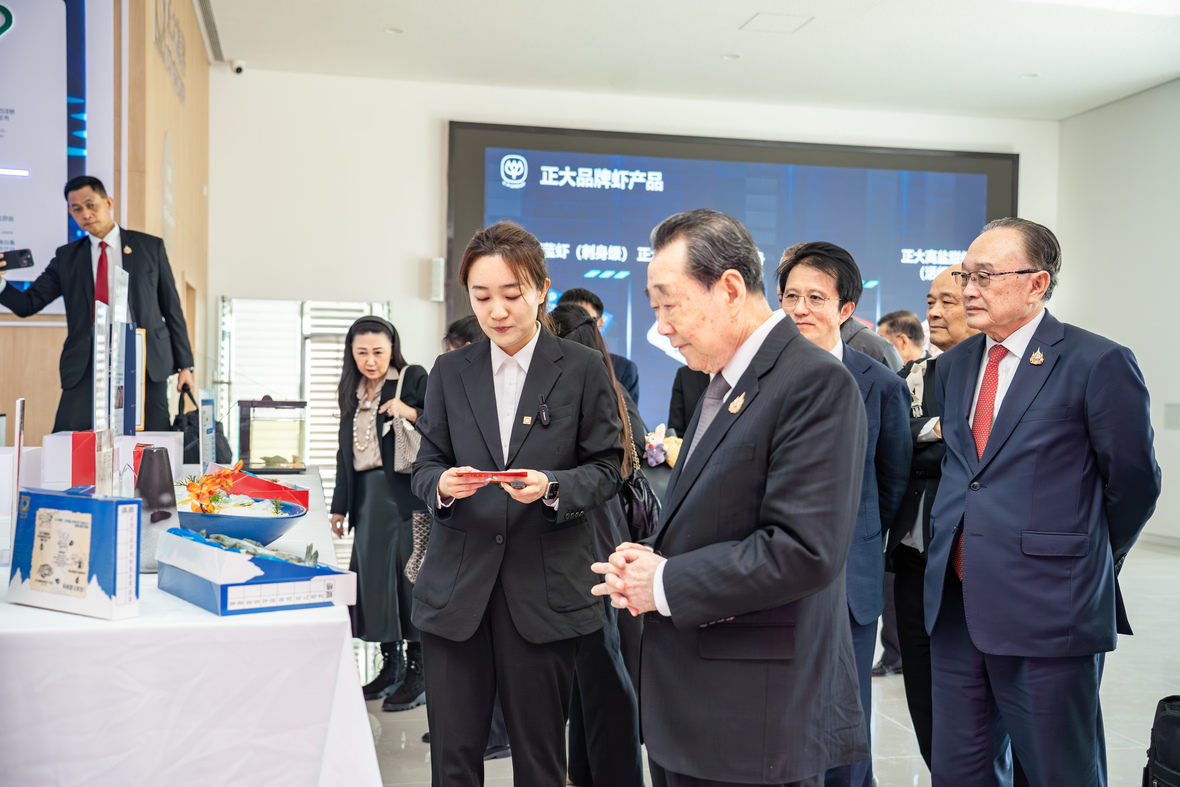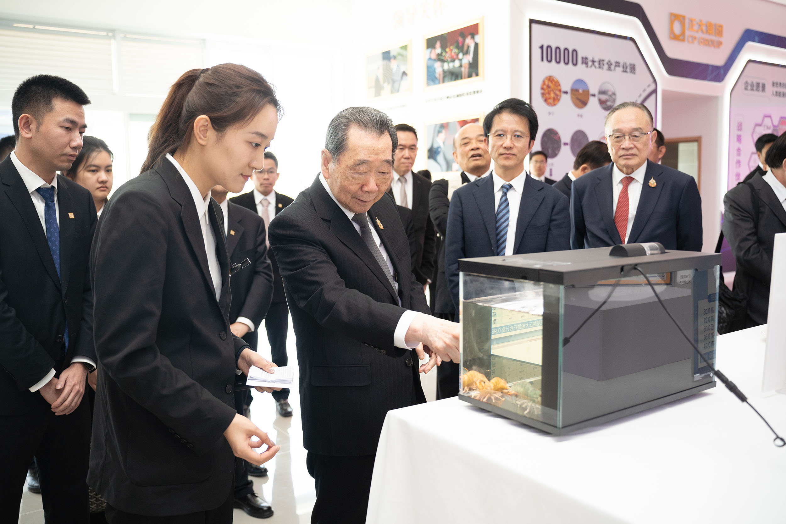 正大集團資深副董事長蔡益光,十三屆汕頭市政協主席、第二十二屆國際潮團總會主席謝澤生,Concordian 國際創始人謝榆,正大集團資深副董事長謝毅,正大集團農牧食品企業中國區資深副董事長王富杰、中國區水產事業副董事長許智明,CPF水產養殖事業COO Sujint Thammasart,蔡益光集團資深副董事長顧問 Vitit Pootanasup,正大集團飼料原料貿易企業中國二區、印度區首席運營官 Thita Tangruthaivanich,CPF水產養殖事業研發負責人 Premsak Wanuchsoontorn,正大集團中國區水產事業財務總監張松榮等陪同考察。