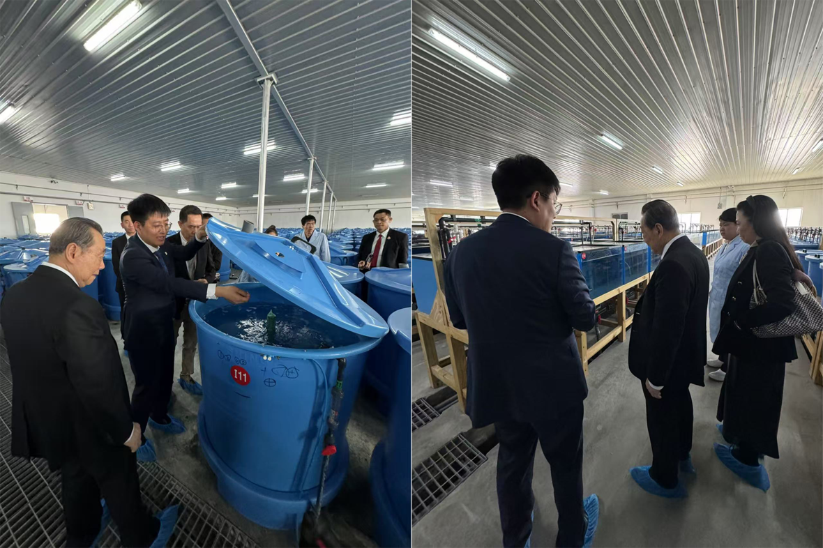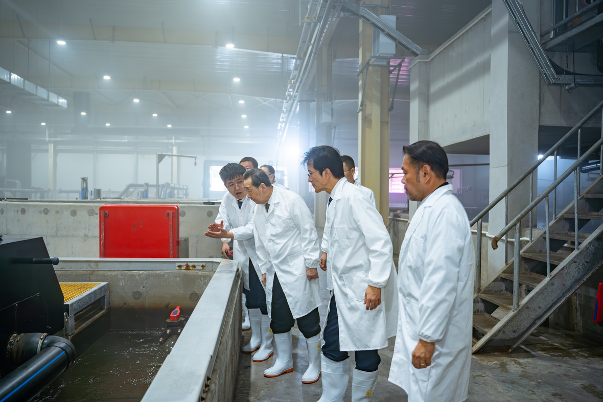 在東營正大水產有限公司循環水養殖項目現場,謝國民集團資深董事長一行視察了循環水養殖系統的運行情況,重點詢問養殖品種、養殖規模、水質調控以及銷售策略和市場反饋情況等,并進入養殖車間內部,詳細查看循環水系統對蝦養殖情況和循環水養殖流程。正大研究院動物營養中心蝦料營養專家邱璇博士就相關情況進行了詳細匯報,謝國民集團資深董事長對進一步優化養殖技術、提高養殖產量和質量給予指示。